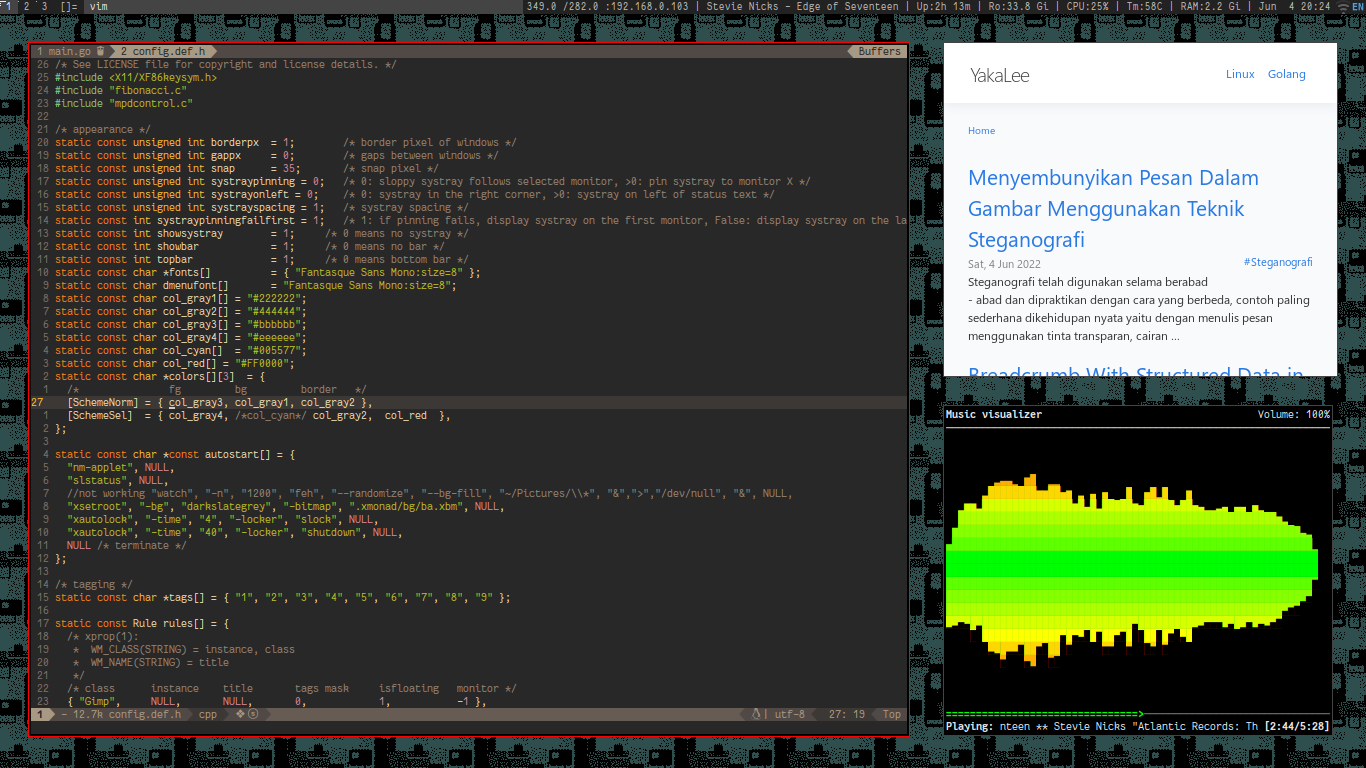 Untuk konfigurasi tambahan lainnya bisa dilakukan dengan menambahkan kode modifikasi pada source kode dwm, baik dengan menggunakan patch ataupun menulis sendiri kode di dalam source kode yang sudah di clone.
